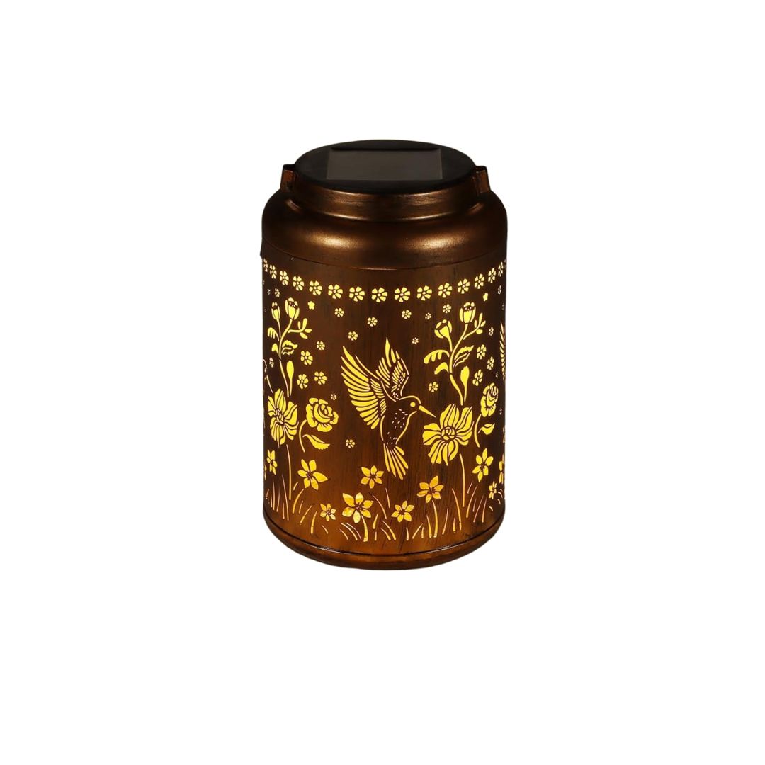 Bring elegance to your outdoor spaces with these solar-powered lanterns. Featuring a retro gold-copper finish and hollowed metal design, they cast warm light with intricate hummingbird patterns, creating a stunning atmosphere for gardens, patios, pathways, or balconies.