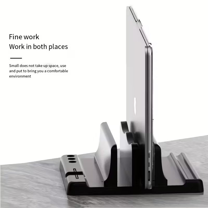 The vertical alignment not only saves space but also promotes better airflow around your laptop, helping prevent overheating. Its minimalist design complements any workspace, from professional offices to home setups.