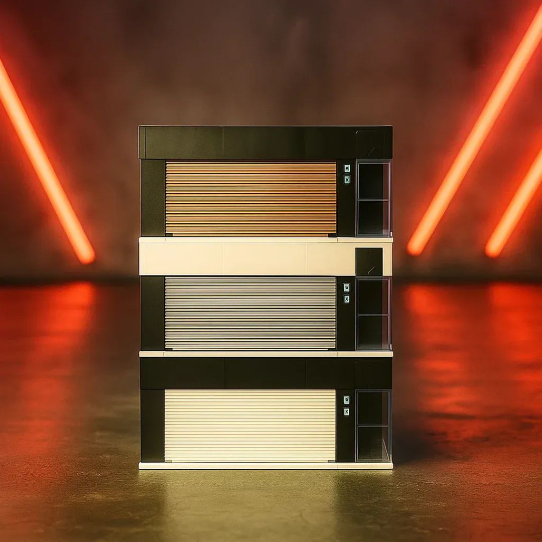 Experience an authentic garage atmosphere with built-in LED lighting that illuminates your collection beautifully. Control the doors manually or by simple voice commands for smooth “open” and “close” actions. The lights can be powered via USB or 3 AA batteries (not included), offering flexibility and ease of use.